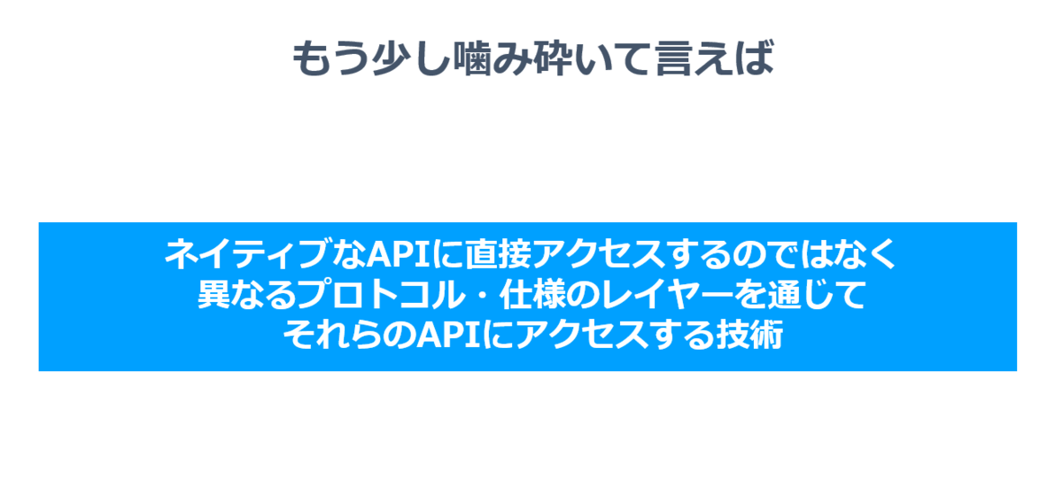 もう少し噛み砕いて言えば、「ネイティブなフォーマット・APIに直接アクセスするのではなく、異なるプロトコル・仕様のレイヤーを通じてそれらのデータにアクセスする方法」となります。