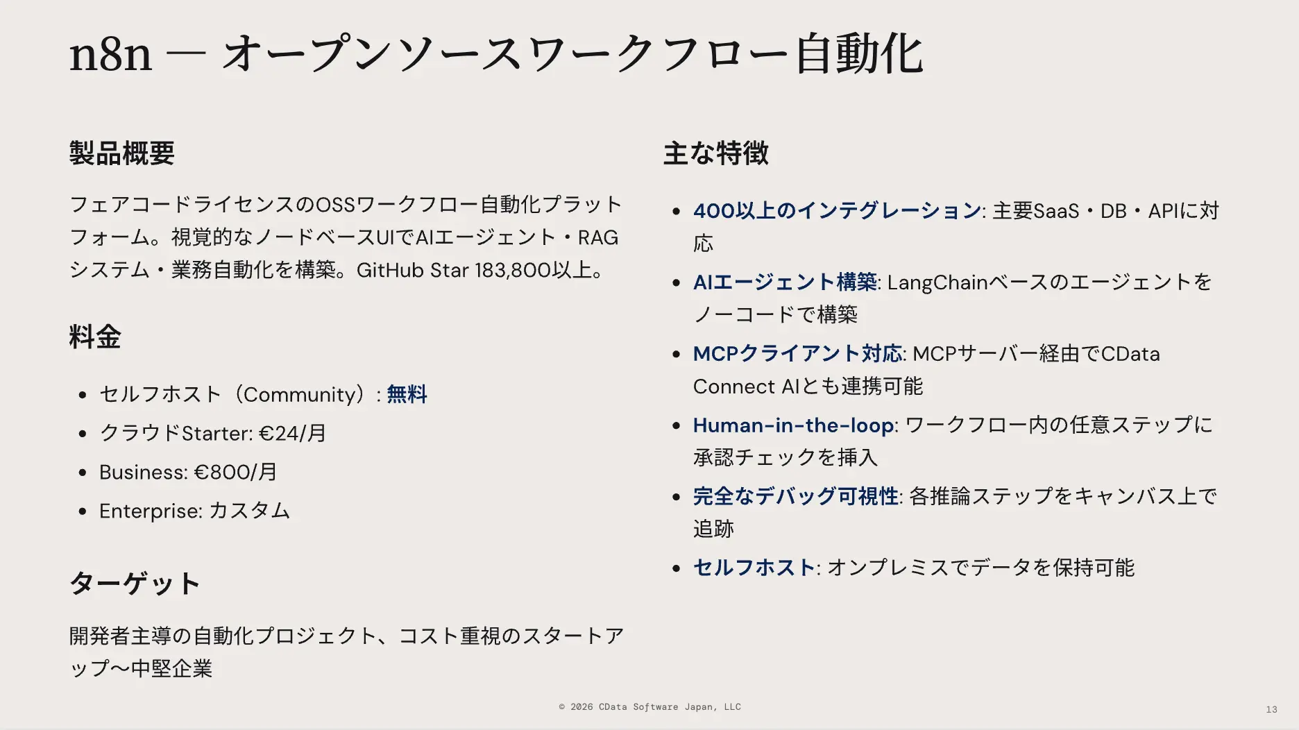 セルフホスト版の無料利用・豊富なAIノード・MCP対応により、プロトタイピングのスピードと柔軟性は群を抜いています。CData Connect AIをMCPサーバーとして組み合わせることで、エンタープライズデータへのガバナンス付きアクセスも実現できます。