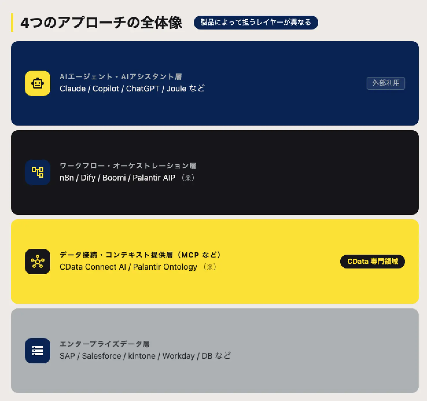 このレイヤー図で重要なのは、製品によって担うレイヤーが異なるという点かなと思います。CData Connect AI は「データ接続・コンテキスト提供層」に特化しているのに対し、他の製品はより広い範囲をカバーするフルスタック型のアプローチを取っています。