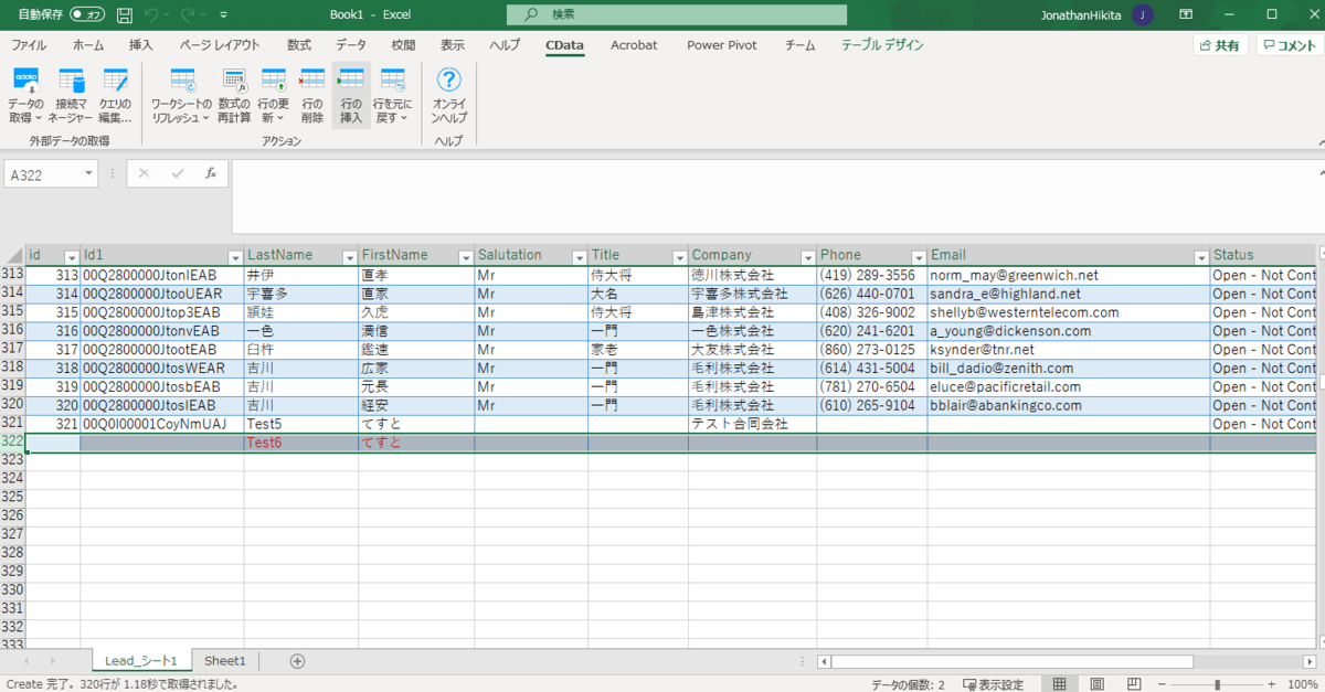 先ほどのスプレッドシートのLead データをロードしたExcel テーブル上で普通に変更したいセルを変更します。 さらにExcel の置換機能やコピペももちろん使えます。