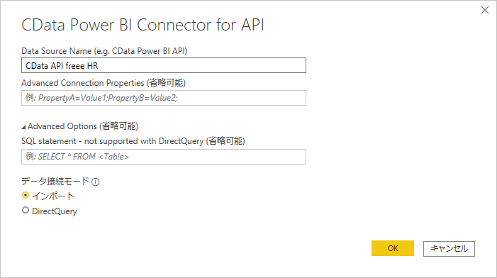 最初に接続するためのウィザードが表示されるので、「CData API Driverのインストール」の内容と同様に各種パラメータを入力します。