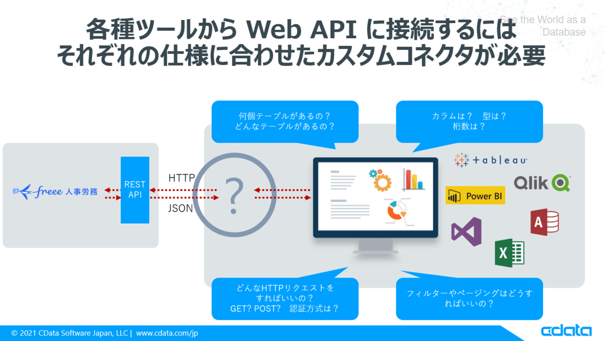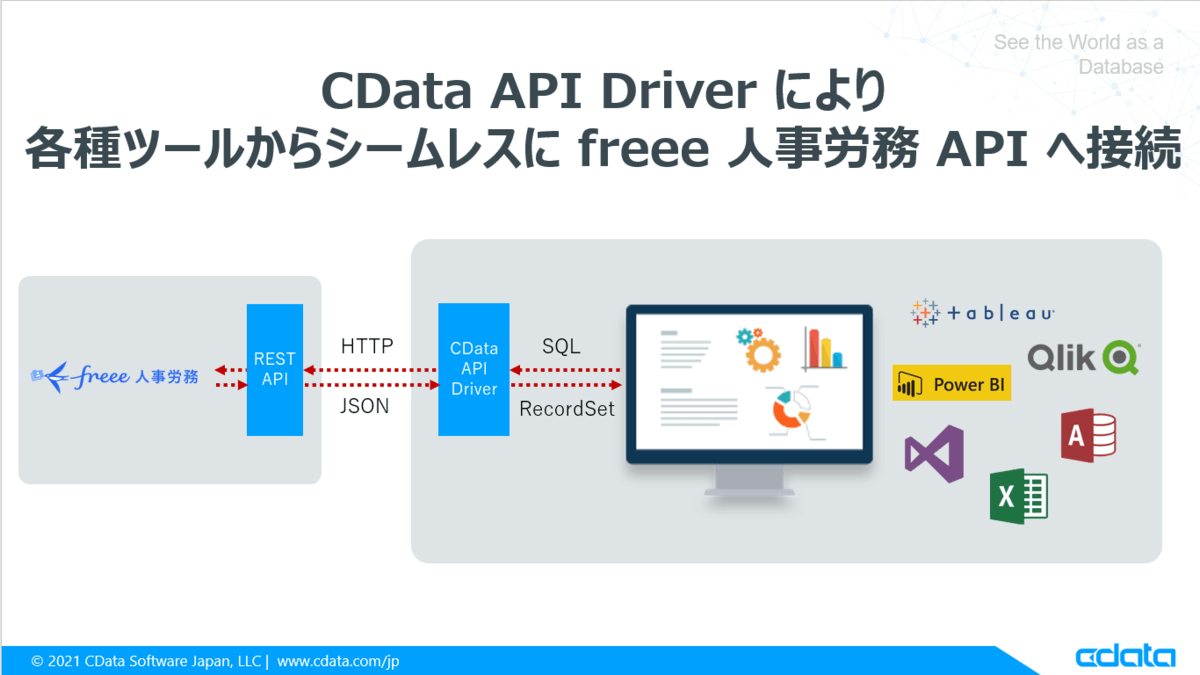 本記事では、各種 Web API を ODBC / JDBC / ADO.NET といった標準のDB接続規格でアクセスできるようにするCData API Driverを用いて、freee 人事労務 の API を各種ツールから接続する方法を紹介します。