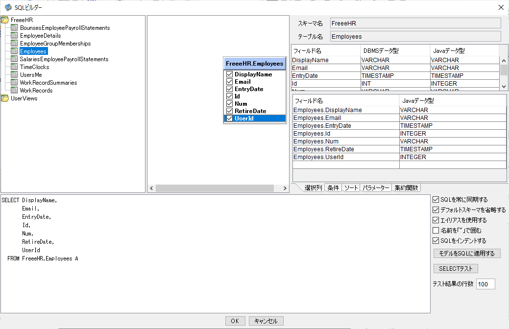 あとは、「モデルにSQLを適用する」をクリックし「SELECTテスト」でデータが正常に取得できているかを確認します。