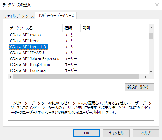 データソースの選択では「コンピューターデータソース」から事前に作成したCData API Driver用DSNを選択し「OK」をクリック
