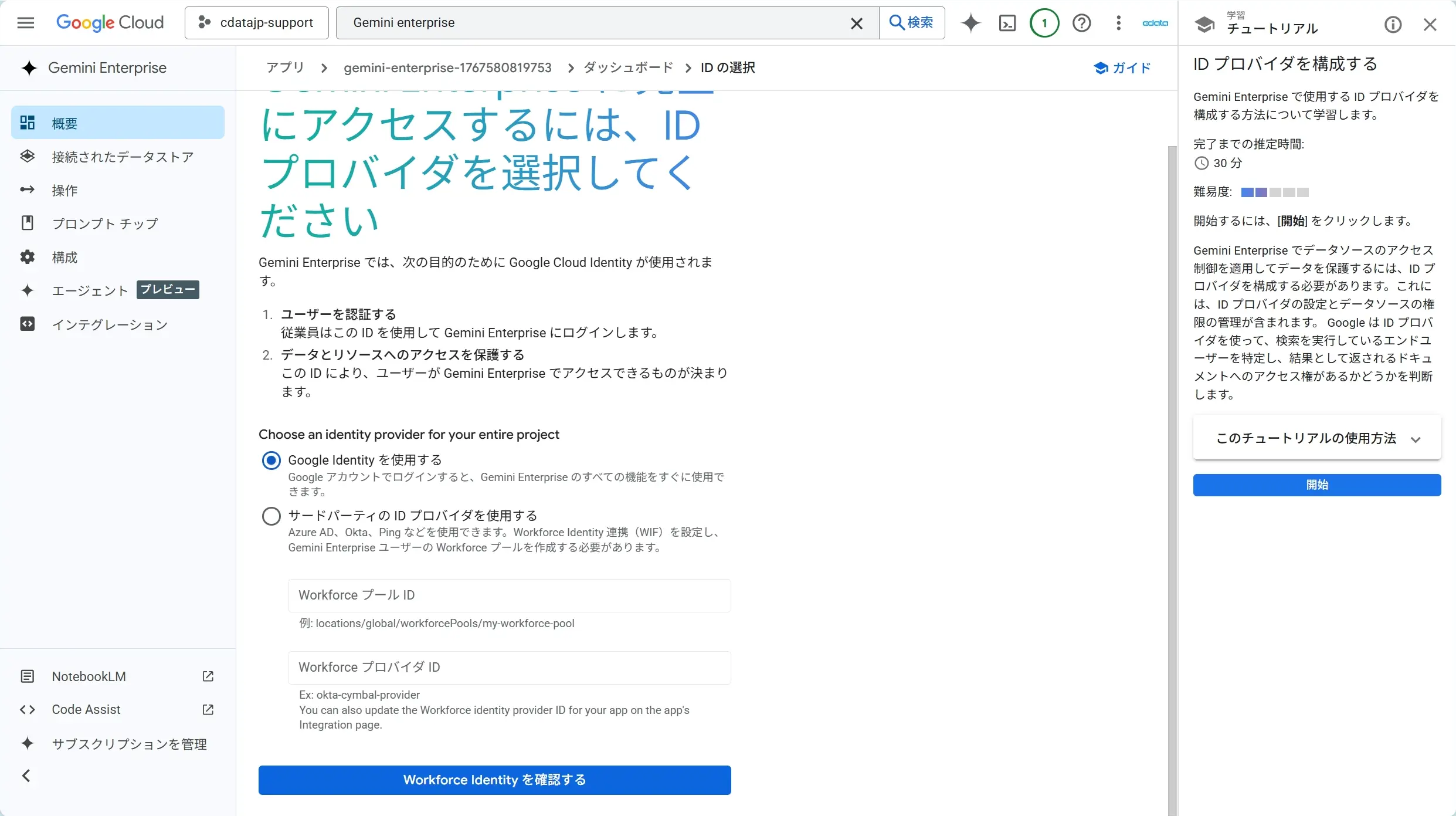 ちなみに最初にGemini Enterprise にアクセスするためのIDプロバイダを指定する必要があります。