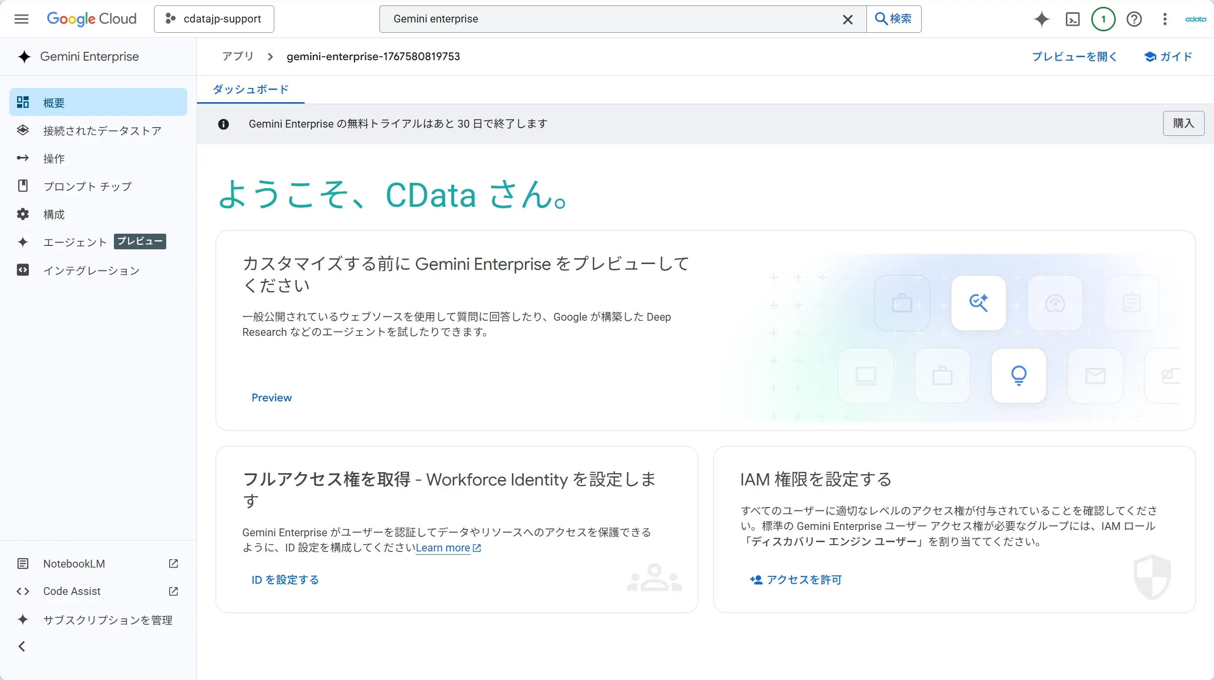 以下のようにGoogle Cloud のコンソールから「Gemini Enterprise」と検索することで、30日間の無料トライアルを始めることができます。