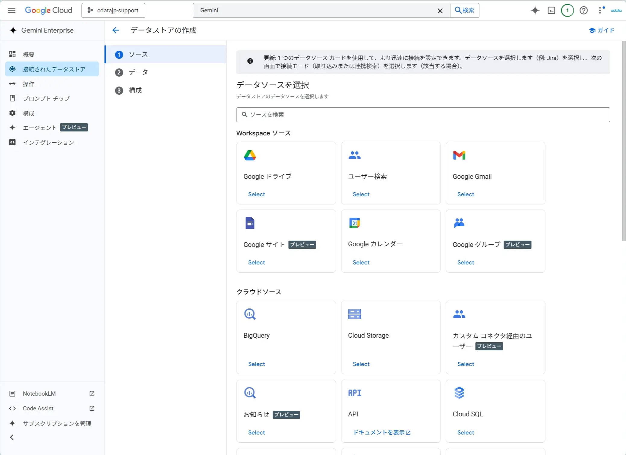 「接続されたデータストア」の画面では、Google ドライブやGmail などへの接続設定が構成できます。