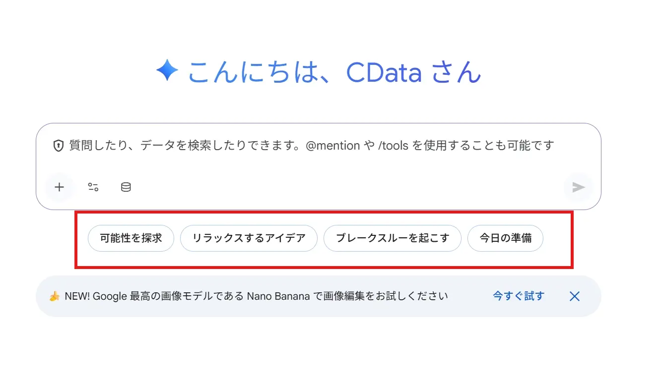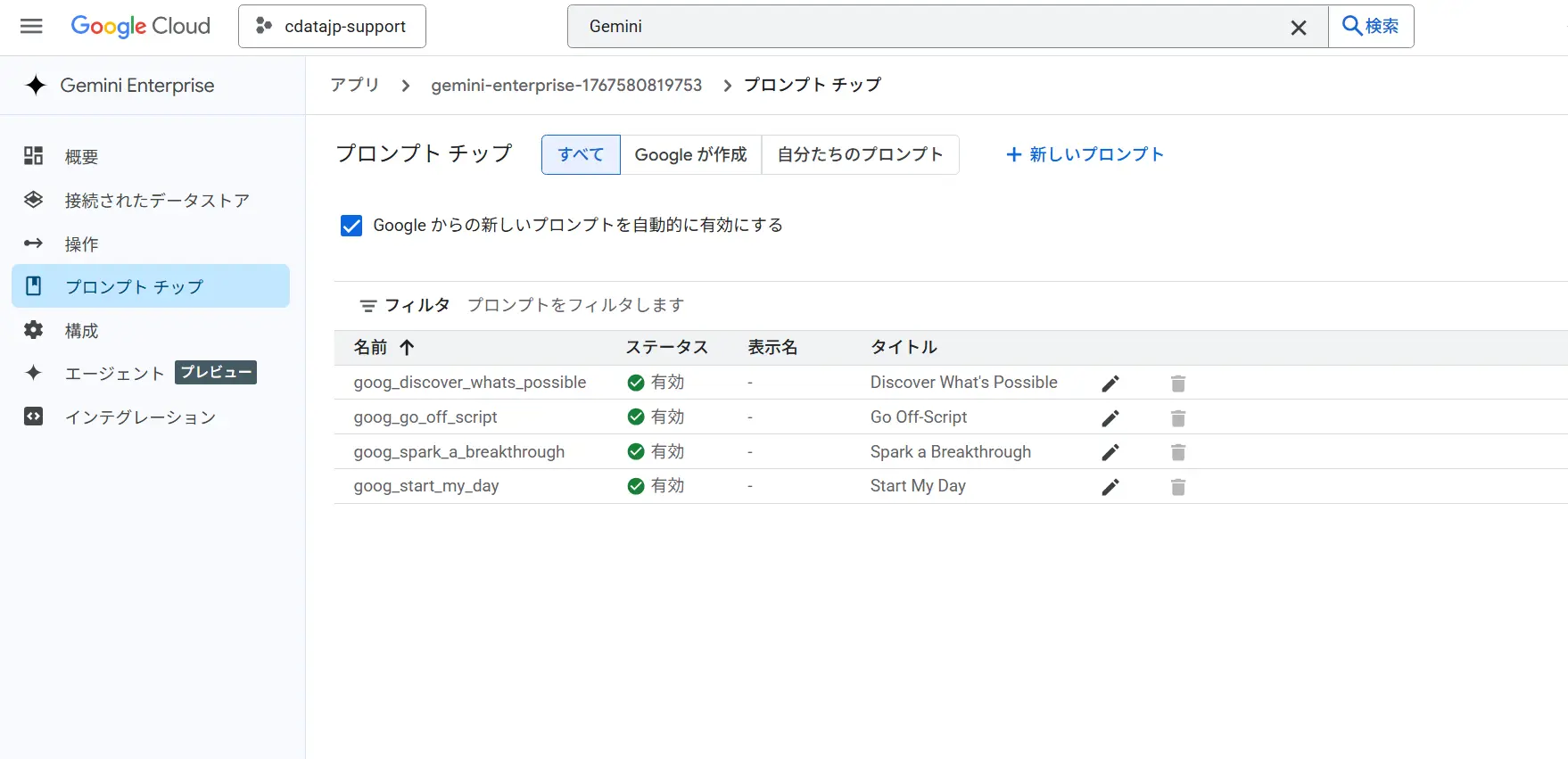 「プロンプトチップ」はGemini Enterprise のウェブ画面の最初に表示されるプロンプトサンプルのような機能ですね。これをカスタムで準備できるみたいなので、あまりGemini を使い慣れていない方におすすめのカスタマイズ機能ですね。