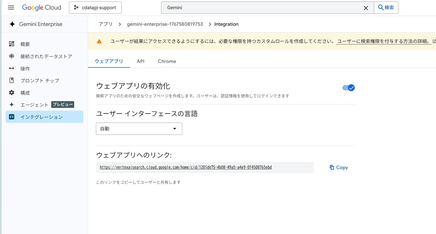 これで以下のようにGemini Enterprise ウェブアプリの準備が完了します。実際のビジネスユーザーはこのURL から利用していく形になります。