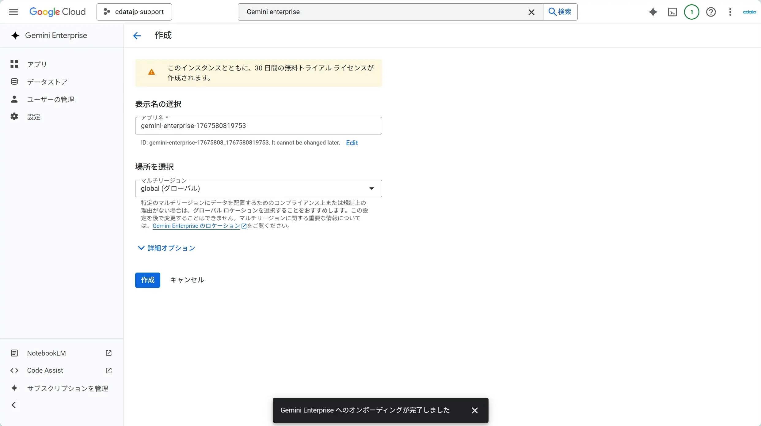 その後、Gemini Enterprise の表示名・場所(リージョン)を指定します。トライアル段階ではデフォルトでも良いかなと思います。