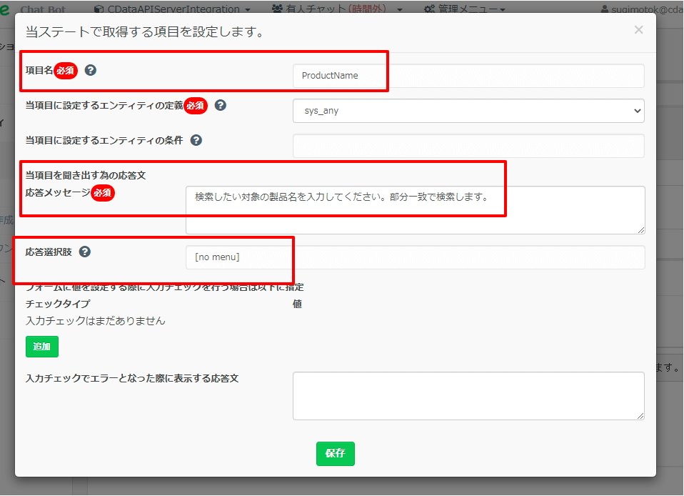 - 応答メッセージ:ユーザーに入力を求める際のメッセージを指定します。「検索したい対象の製品名を入力してください。部分一致で検索します。」と指定しました。