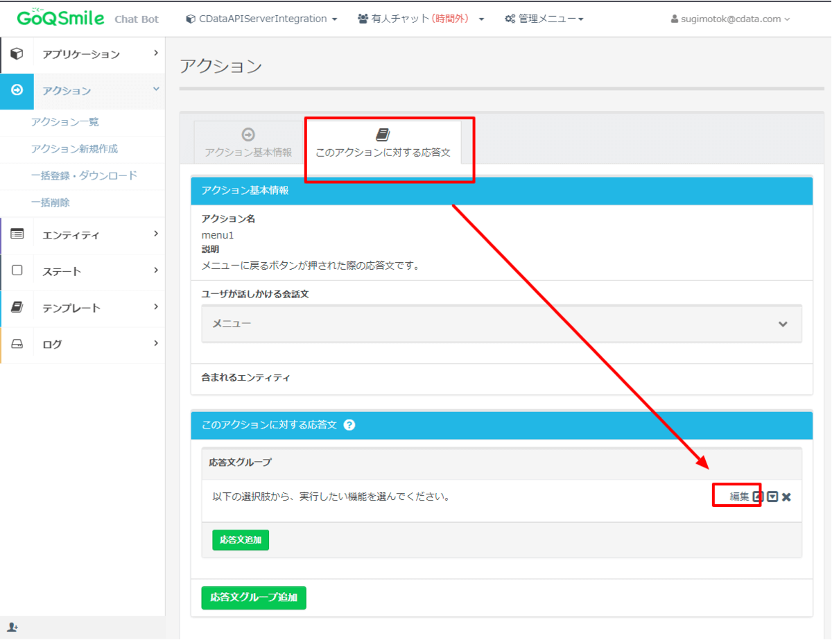 「このアクションに対する応答文」から応答文を編集します。
