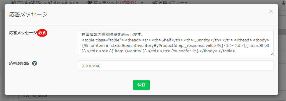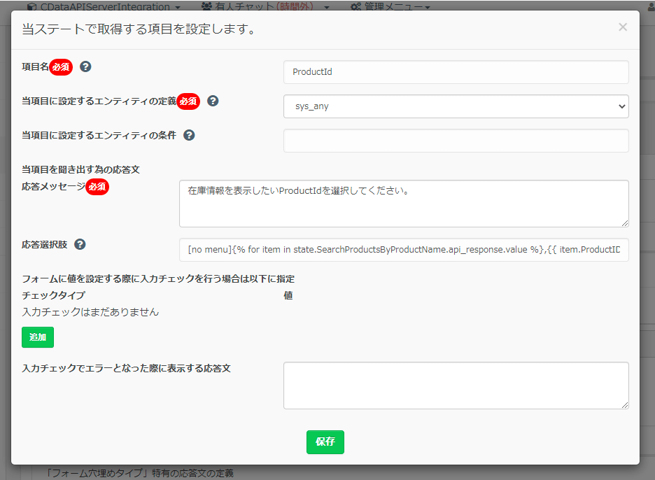 - 応答メッセージ:ユーザーに入力を求める際のメッセージを指定します。「在庫情報を表示したいProductIdを選択してください。」と指定しました。