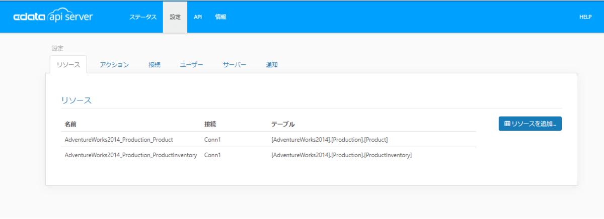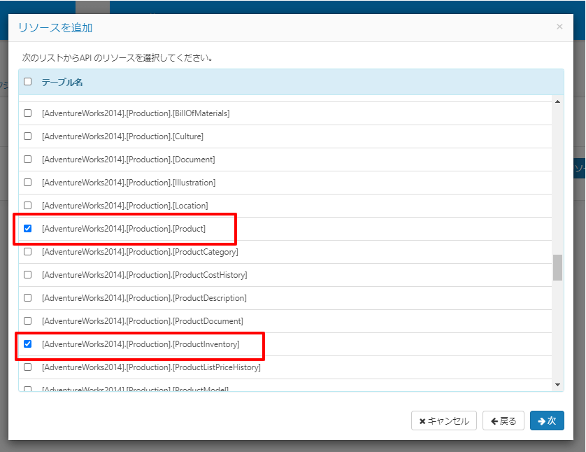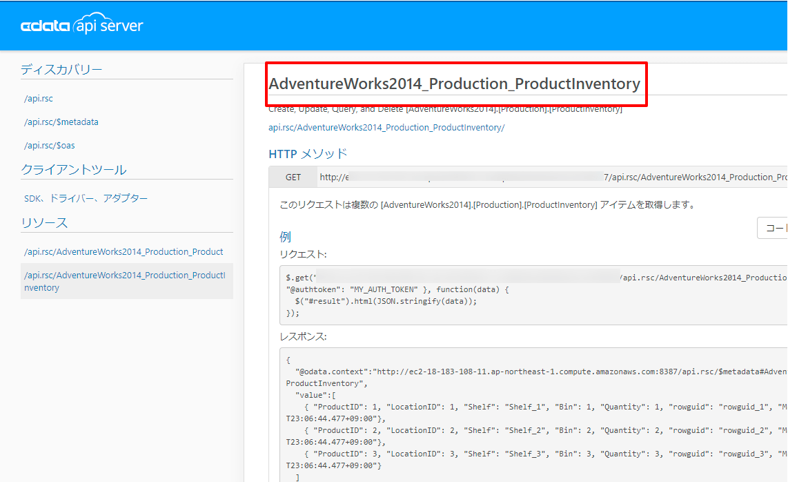 今回は在庫情報を取得できるエンドポイントである「AdventureWorks2014_Production_ProductInventory」を指定します。