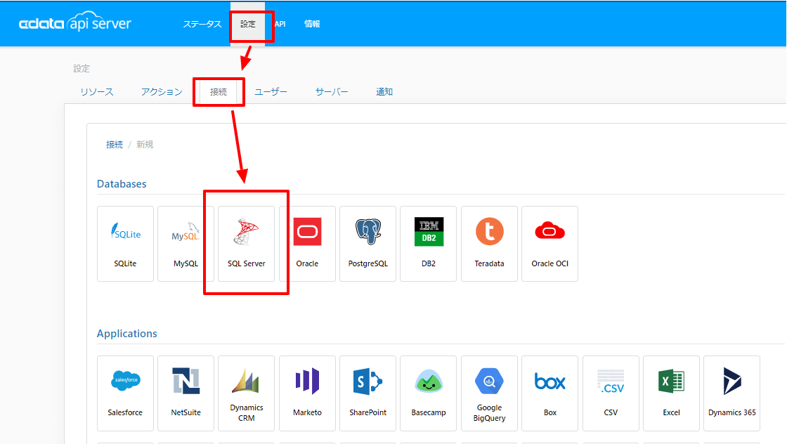 API Serverの管理画面にログインし「設定」→「接続」で、接続先サービスの一覧から「SQL Server」を選択します。