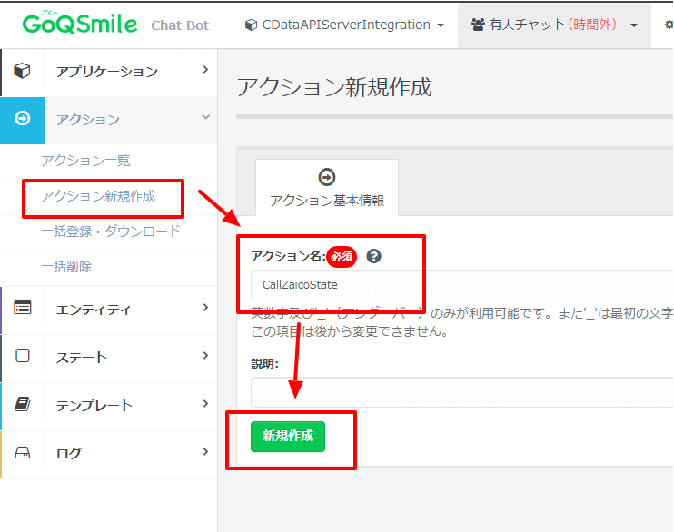 「アクション新規作成」をクリックし「CallZaicoState」というアクションを作成しました。
