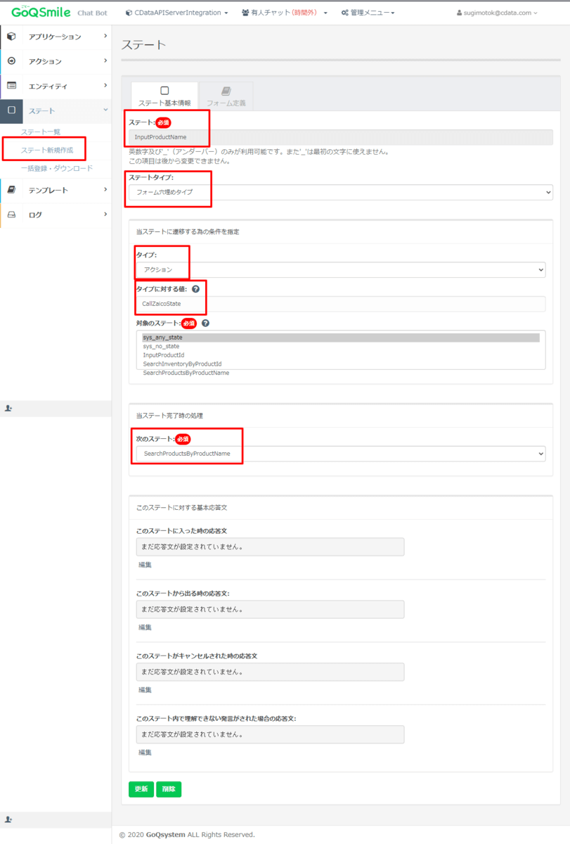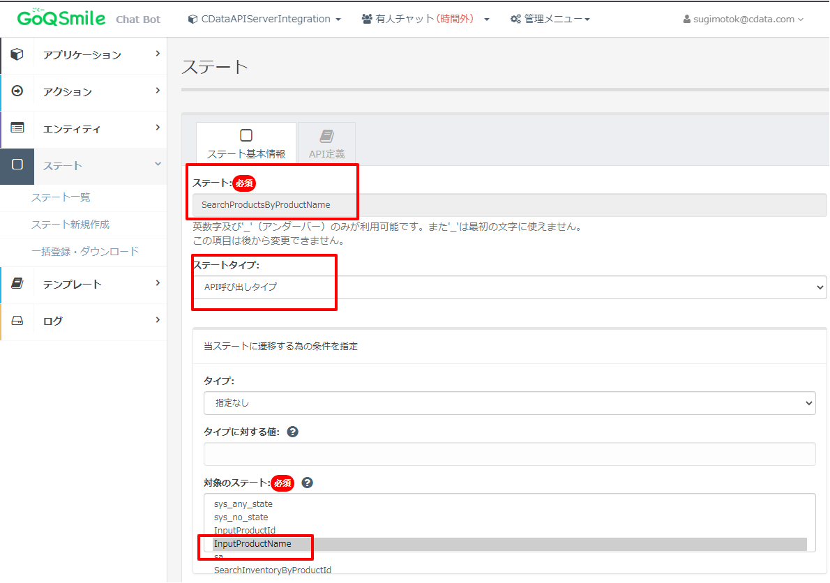 先程のアクションからこの製品名を入力させる本ステートを実行し、その後入力された値を元に、Web APIをコールするという流れです。