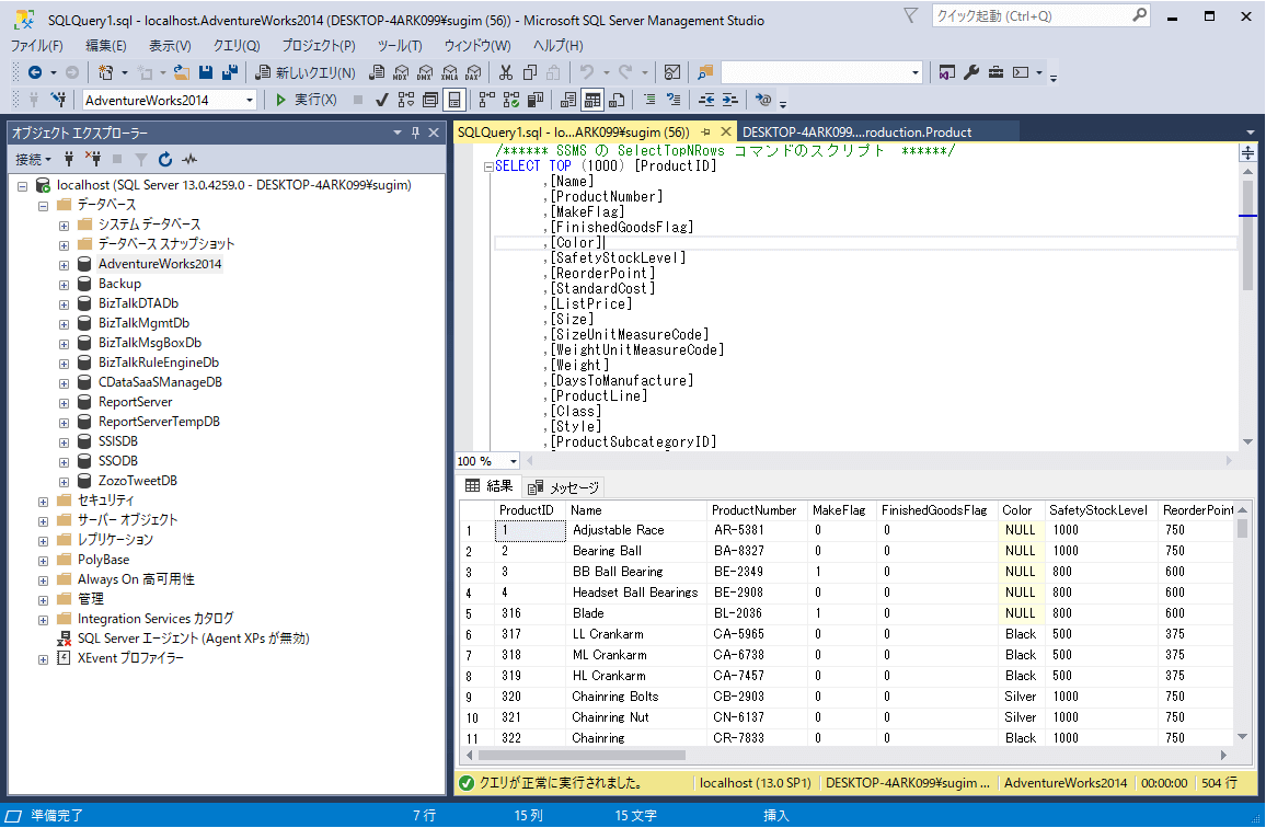 SQL Serverには予めサンプルデータベースとして、AdventureWorks2014を構成しています。このデータベースの「Product」「ProductInventory」を今回は使用します。
