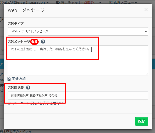 - 応答選択肢:「在庫情報検索,顧客情報検索,その他」と入力します。