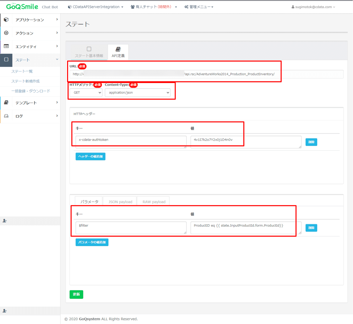 - パラメータ1:フィルターを行うための指定です。キー:「$filter」、値:「ProductID eq {{ state.InputProductId.form.ProductId}}」と指定します。「{{ state.InputProductId.form.ProductId} }}」は手前のステートで入力された値を指定しています。