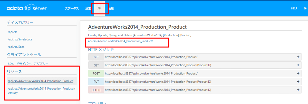 - URL:API Serverで構成したURLを指定します。「http://XXXXX/api.rsc/AdventureWorks2014_Production_ProductInventory」と指定します。