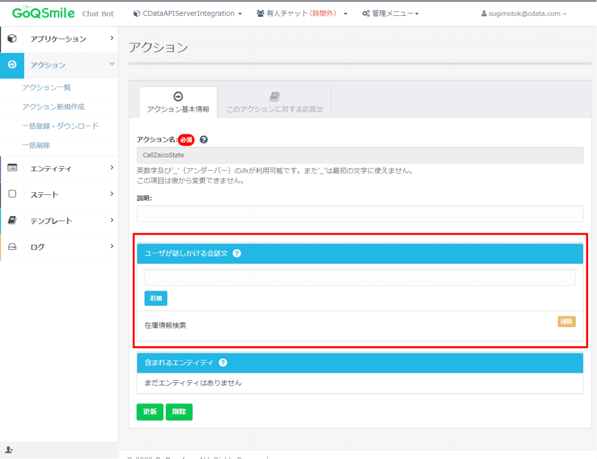 このアクションには、「ユーザーが話しかける会話文」として「在庫情報検索」のみ定義しています。