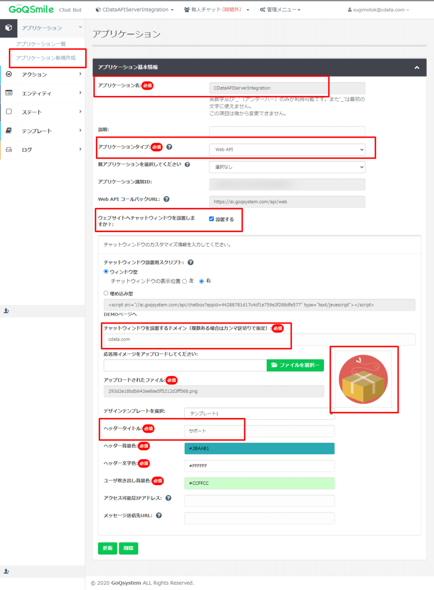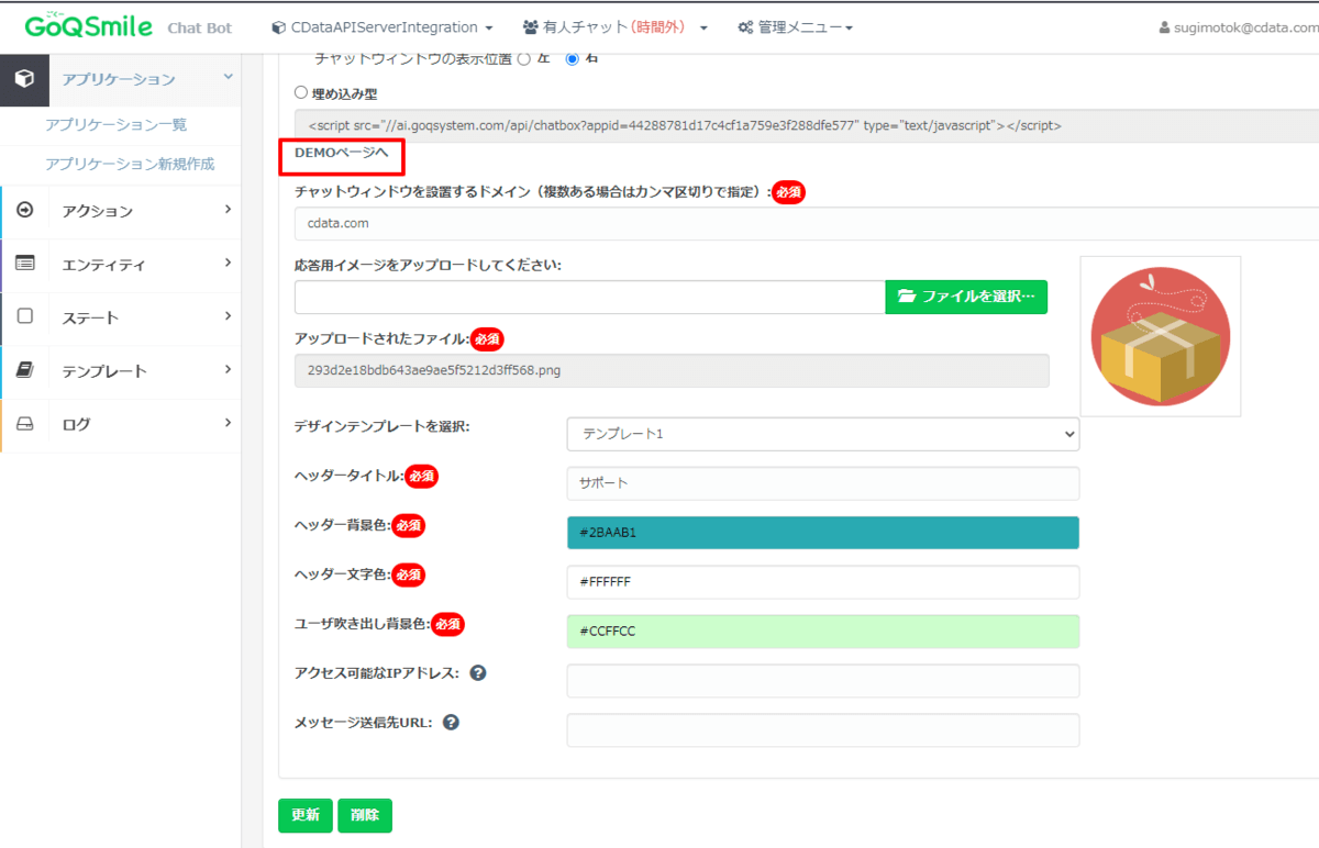 - 応答用イメージ:チャットボットの応答時の画像を指定します。任意のものをアップロードして、指定してください。