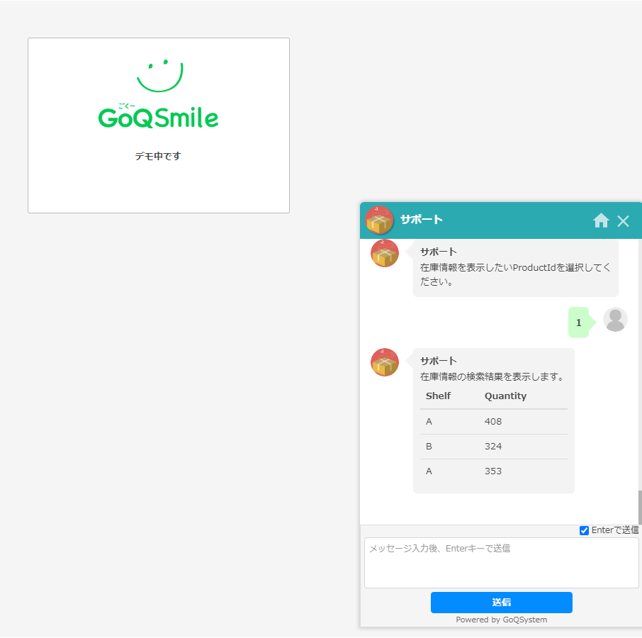 アプリケーションの管理画面から「DEMOページへ」をクリックすると、実際にチャットボットを試すことができます。