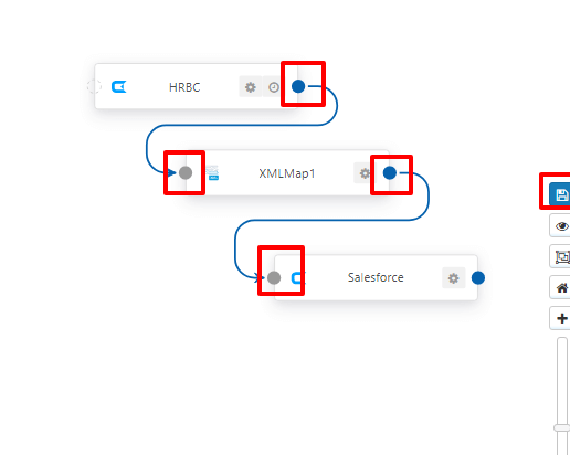 Connector構成後、まずそれぞれのInputとOutputを紐付けます。以下のようにドラッグアンドドロップで、事前に作成した HRBC / Salesforce Connectorと紐付けて、画面右下にある保存ボタンをクリックすればそのままOKです。