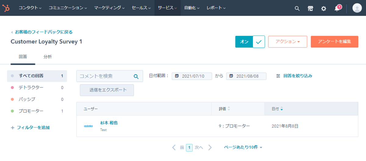 ここでアンケート(サーベイ)の種類や名前、顧客のEmailアドレス、その顧客の回答レート、フィードバックのタイプが良好だったのか、悪かったのか、また顧客が回答できるフリーテキスト入力のレスポンスを得ることができます。