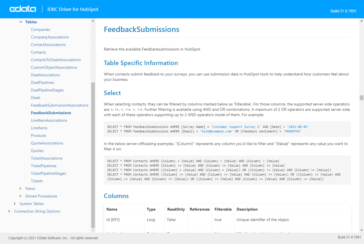 CData HubSpot Driver では今回のアップデートで、この「Feedback Submissions」に対応し、アンケートの回答結果・その内容を取得することができるようになりました。