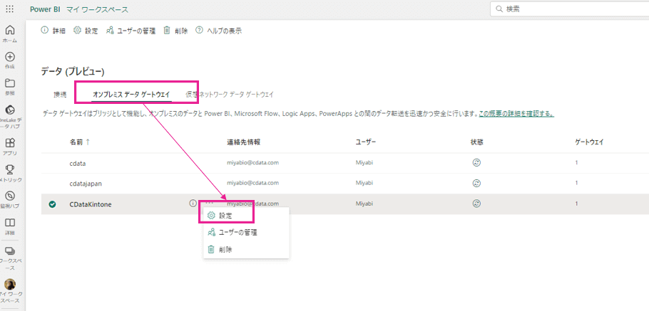 データ(プレビュー)の「オンプレミスデータゲートウェイ」タブを選択し、先ほど作成したオンプレミスデータゲートウェイから、設定をクリックします。