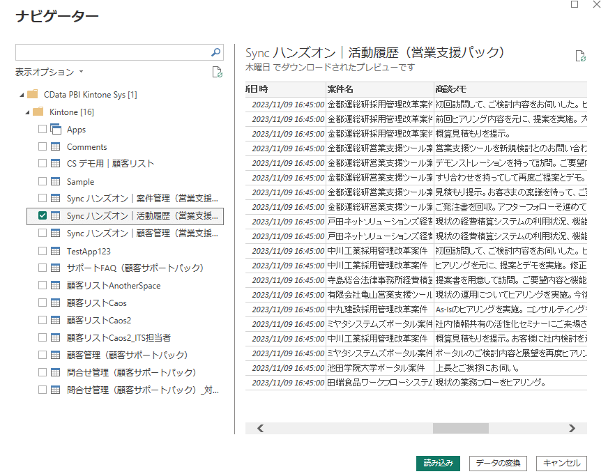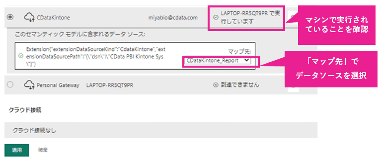 先ほど作成した「新しい接続」の「CData Kintone_Report」を選択して、適用ボタンをクリックします。
