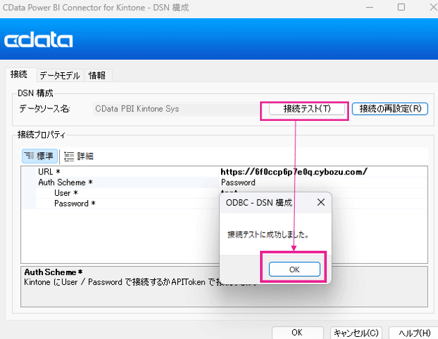 必須項目の入力を終えたら、接続テストを行います。接続に成功したら、「OK」ボタンをクリックしてください。