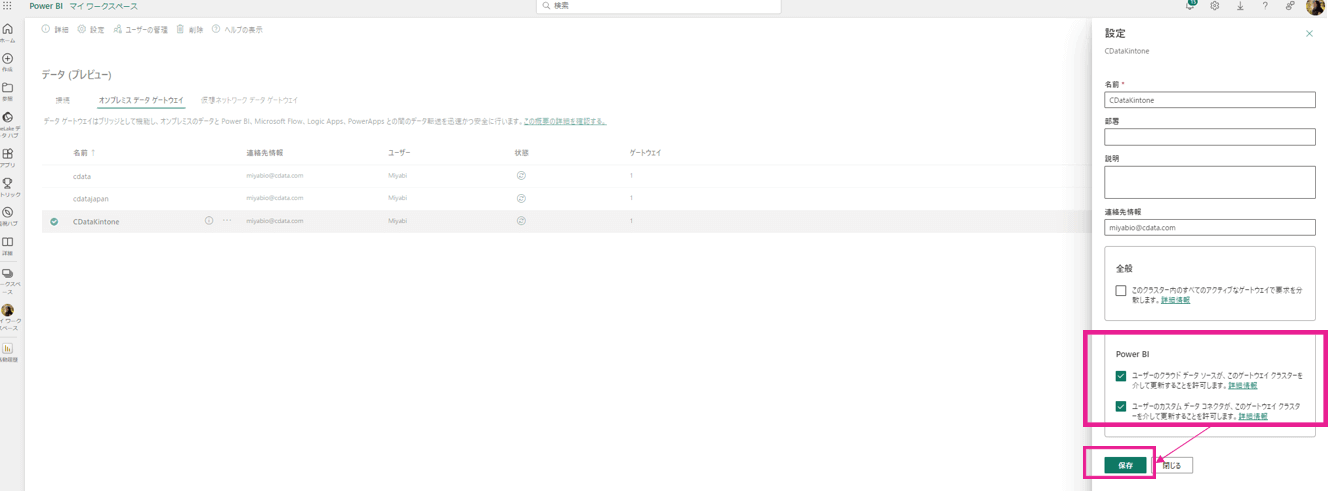 「ユーザーのクラウドデータソースが、このゲートウェイクラスターを介して更新することを許可します。」と「ユーザーのカスタムデータコネクタが、このゲートウェイクラスターを介して更新することを許可します。」にチェックを入れて保存します。