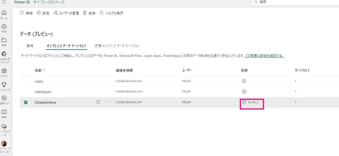 「状態」から、On-premise data gateway がオンラインで使用できることを確認します。