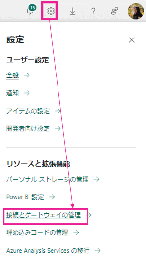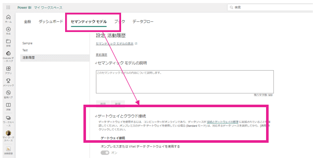 セマンティックモデルの「ゲートウェイとクラウド接続」を開きます。