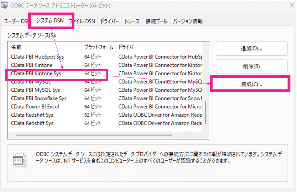 まずは、Windows メニューから「ODBC データ ソース(64bit)」と検索してください。「システムDSN」から「CData PBI Kintone Sys 64ビット」を選択して、「構成」ボタンをクリックします。