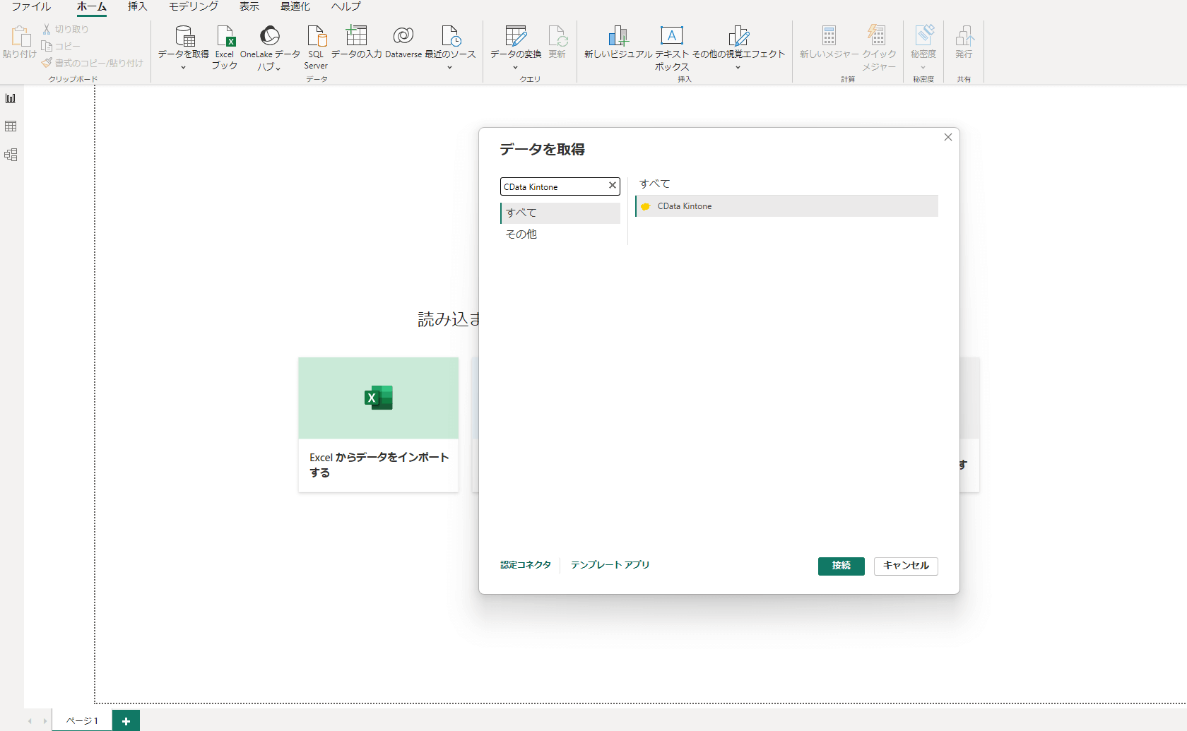 Power BI Desktop から「データを取得」をクリックして「CData Kintone」を選択してください。次に接続ボタンをクリックします。