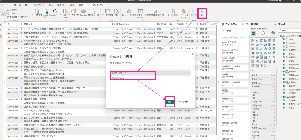 オンプレミスデータゲートウェイの接続が完了したので、次はPower BI Service にレポートを発行します。Power BI Desktop 上の「発行」ボタンをクリックして、指定のワークスペースを選択してください。