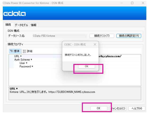 下記のように「接続テストに成功しました。」が表示されたら、OKをクリックします。CData Power BI Connector for Kintone -DSN構成のOKも忘れずにクリックしてください。