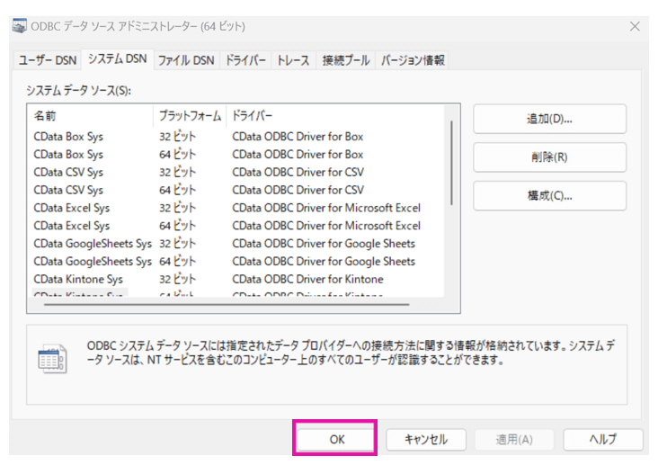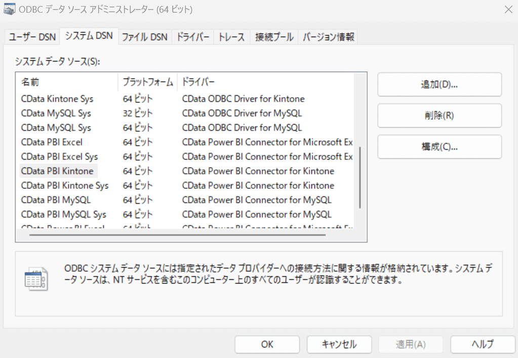「システムDSN」>「CData PBI Kintone」>「構成」の順で進んでください。
