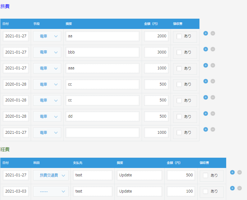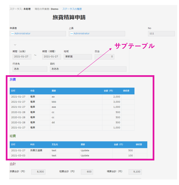 例えば、「旅費精算申請」というkintone アプリ内に「旅費」/「経費」というテーブルフィールドがある場合、それらがサブテーブルとなります。
