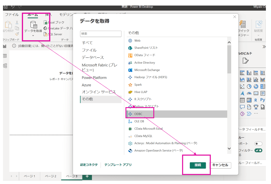 Power BI Desktop の「データを取得」からODBCを選択して、接続します。