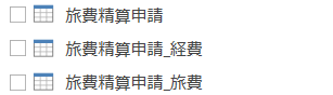 今回は、経費と旅費がサブテーブルになるので、サブテーブルのデータは「旅費精算申請_経費」と「旅費精算申請_旅費」というテーブルとして取得します。