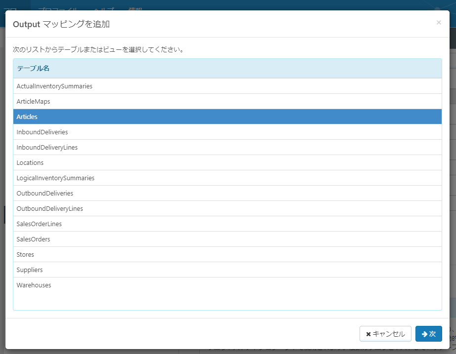 ロジレスで使用できるテーブル一覧が出てくるので商品マスタデータを取得できる「Articles」を選択します。