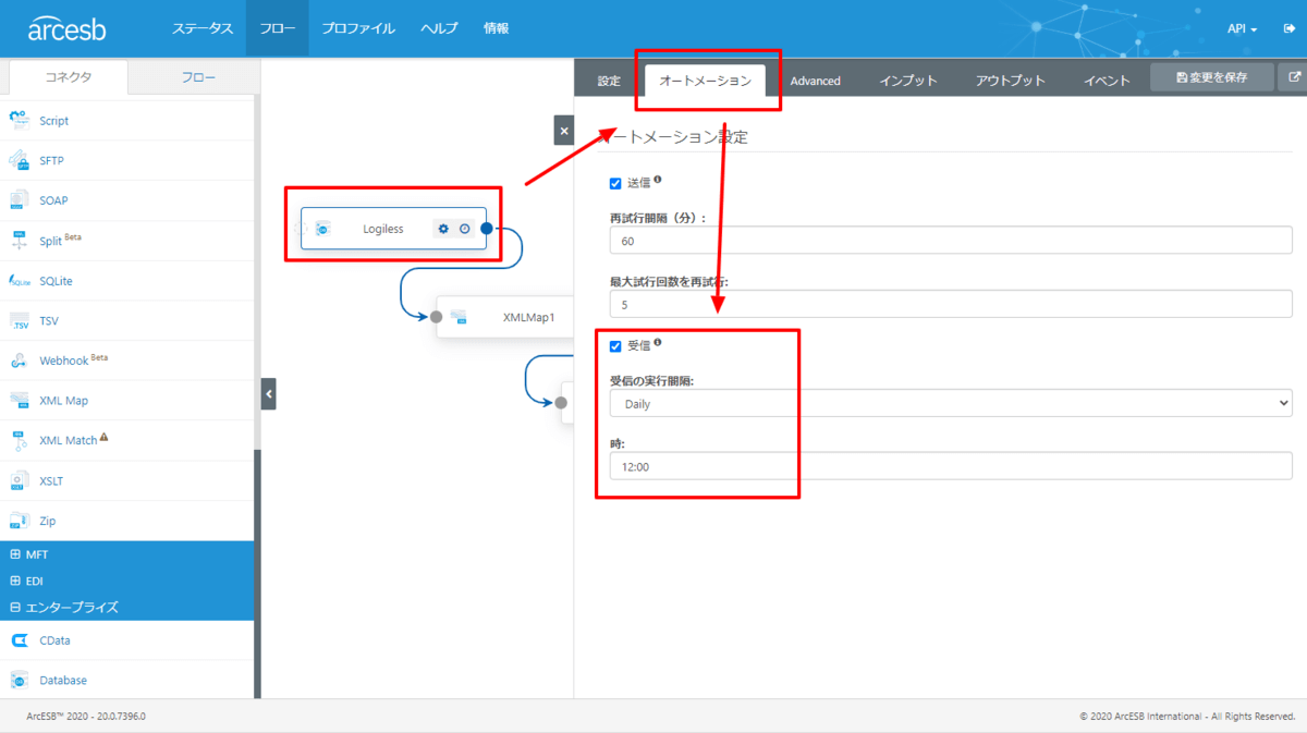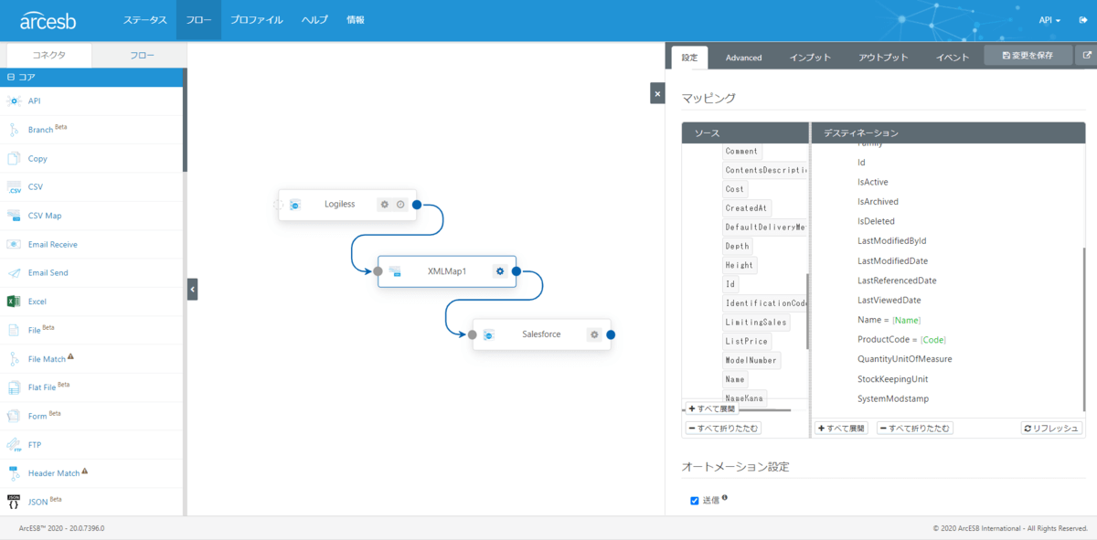Connector構成後、まずそれぞれのInputとOutputを紐付けます。以下のようにドラッグアンドドロップで、事前に作成した ロジレス / Salesforce Connectorと紐付けて、画面右下にある保存ボタンをクリックすればそのままOKです。