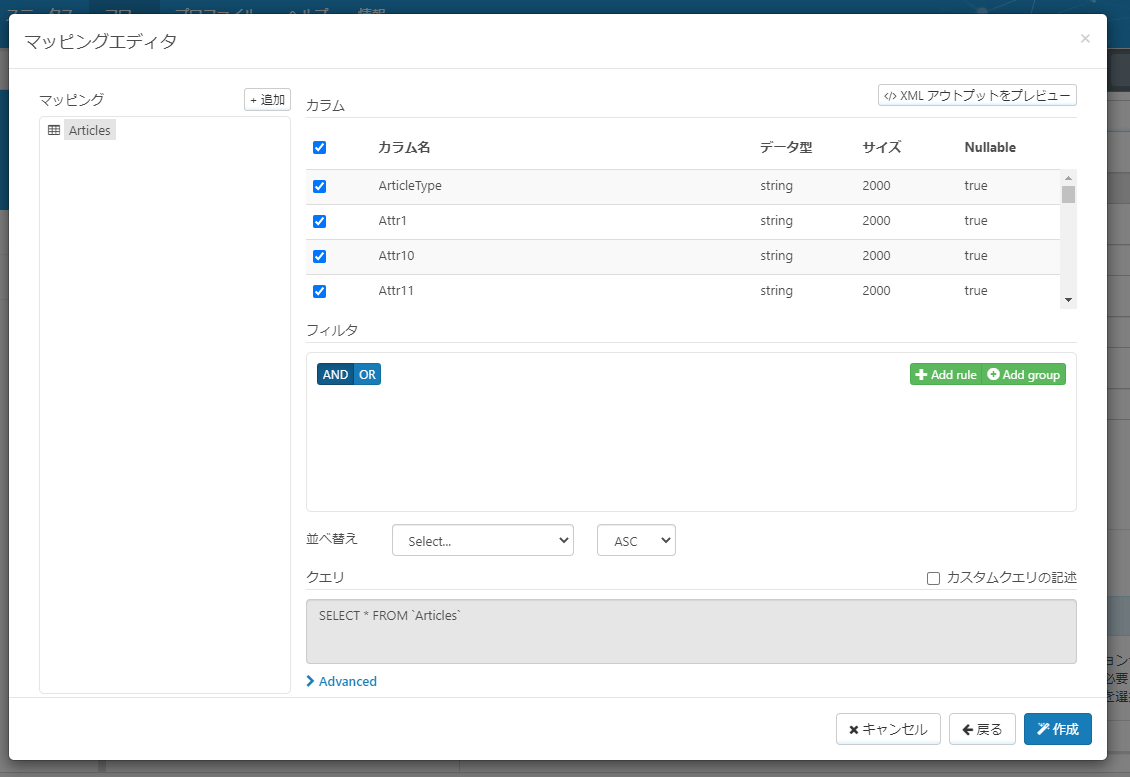 次の画面に移動すると、取得する項目や諸条件を指定することができるMapping Editorに移ります。