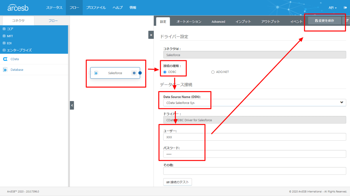 接続の種類から「ODBC」を選択し、今度はSalesforceのDSNを選びます。また接続先となるSalesforce 環境の「User」「Password」を入力し、「変更を保存」をクリックします。