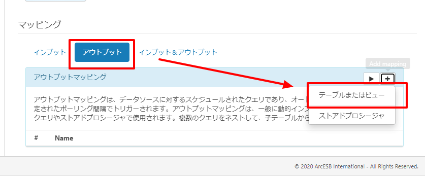 次に取得したいテーブルを選択するために、マッピングのアウトプットタブから「+」ボタンの「テーブルまたはビュー」をクリックします。